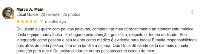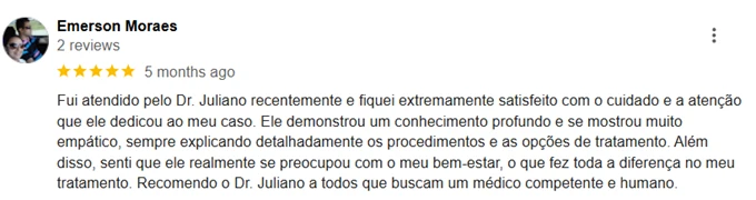 O Dr. Juliano atende apenas no modelo particular. Isso garante um atendimento mais personalizado e com total foco nas suas necessidades, sem limitações de tempo ou burocracias.