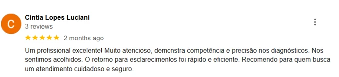 Você receberá atenção totalmente personalizada. Temos o tempo necessário para conversar sobre seus sintomas, histórico e preocupações, garantindo um atendimento bem mais cuidadoso, sem pressa.